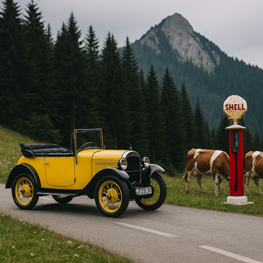 Der Prompt war „Generiere ein Foto von einem Dixi Oldtimer in gelber Farbe, der über einen Berg fährt. Im Hintergrund sind Tannenbäume zu sehen, vorne eine Tankstelle und 2 Kühe“