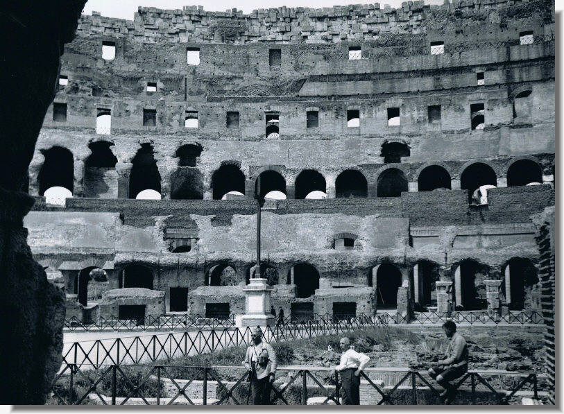 Erinnerungsfoto im Kolosseum. Die Strapazen der Fahrt gingen auch auf den BMW Dixi nicht spurlos vorbei. Ein Bremsseil war gerissen und wurde in Rom ersetzt. Die geplante Weiterfahrt nach Neapel wurde abgebrochen, weil kein Hinweisschild dorthin zu finden war und jedermann von einer Fahrt dorthin abriet (heute auch noch so!). Am 2. Juli klappte es doch noch mit der Audienz. Die Aachener hatten sich ein Empfehlungsschreiben vom Hochwürden Herrn Pfarrer Schagen aus AC-Brand geben lassen, sodass nach vielen „Prüfungen“ ein Audienzschein erstellt wurde. Nun folgt im Bericht eine ausführliche Schilderung über den Empfang beim Heiligen Vater und den päpstlichen Segen.