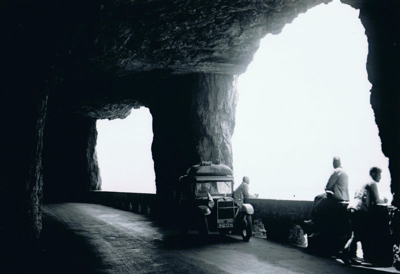 Durch die herrliche Alpenwelt über die Zirlerbergstraße, bekannt durch haarscharfe Serpentinen und Gefälle von 28 % und den vielen im Felsen eingehauenen Namen und Kreuze wegen der dortigen Unglücksfälle, führte der Weg nach Innsbruck. Am Fuße des Iselberges wurde erst einmal ein Bierchen getrunken und eine Virginiazigarre von 30 cm Länge geraucht. Nun gings munter dem Brennerpass entgegen. Der BMW gab alles her und schaffte es, bestaunt von den vielen Autofahrern, die 100 PS unter der Motorhaube hatten.