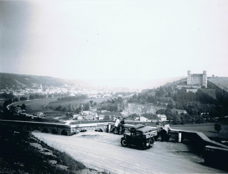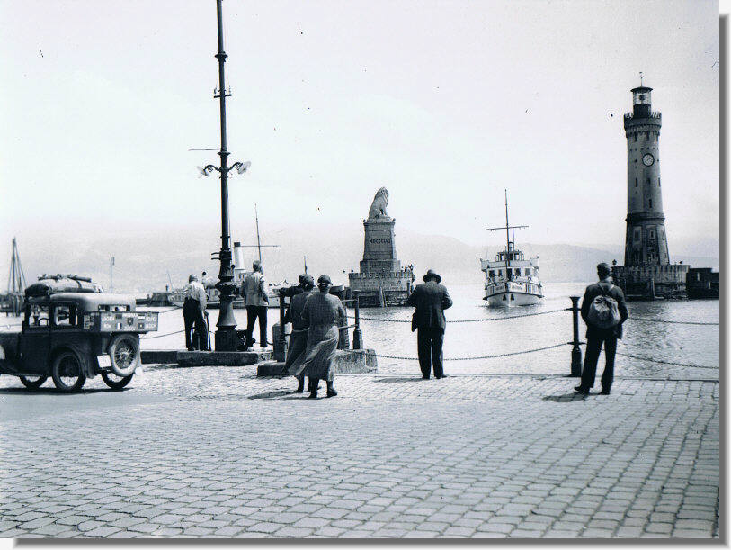 Der Lindauer Hafen mit dem bayrischen Löwen. Nach einigen „Pötten“ „bayrischen Biers“ geht es nach Friedrichshafen zum Zeppelin-Museum. Hier ist im Reisebericht eine ausführliche Beschreibung über das Luftschiff „Graf Zeppelin“ beigefügt. Entlang des Sees führt der Weg nach Meersburg, wo sie an Anette von Droste-Hülshoff gedachten. Ein leichter Regen setzt nun ein auf der Fahrt nach Donaueschingen. Im Gasthof „Zum Ochsen“ vor Geisslingen übernachten die Freunde für 70 Reichspfennig pro Person. Der 8. Juli ist der vierzehnte Reisetag. In Donaueschingen werden Schloss und Donauquelle besichtigt. Weiter durch Immendingen durch das Höllental am Hirschsprung vorbei gelangen sie nach Trieberg. Typische Schwarzwaldhäuser werden fotografiert. Entlang der Kinzig kommen sie nach Gegenbach, wo im Gasthof „Zur Blume“ Quartier bezogen wird (50 Rpfg p.P.). Am Samstag, den 9. Juli 1932 fahren sie weiter der Kinzig entlang nach Offenburg, Kehl und wollen über Strassburg, Zabern, Trier in aller Gemütsruhe die Heimreise zurücklegen. In Kehl besorgen sie sich das französische Visum. Auf der Brücke nach Strassburg sind sie von staunenden Gendarmen, Zöllnern, „Franzmännern“ und staunendem Publikum umgeben. Der Dom wird besichtigt und sie sind froh, als sie Strassburg , der ehemaligen wunderschönen Stadt den Rücken kehren können. Hier fallen die Befestigungsanlagen auf und überall stehen „Franzmänner“ mit aufgepflanztem Seitengewehr. Bei Zabern sehen sie die Ausläufer der Vogesen , den Fluss Zorn und die Ruine Greifenstein. . Über Finstigen gelangen sie nach Saargemünd, Saarbrücken und weiter durch das Saargebiet nach Trier, der ältesten Stadt des Reiches. Hier werden Porta Nigra und die freigelegten römischen Thermen bestaunt. Sie verglichen die Bauweise mit den kurz zuvor in Rom besichtigten Bauwerke. Im Kylltal wird zum letzten mal das Zelt aufgeschlagen und von der Höhe sind schon die heimatlichen Eifelberge zu erkennen. In aller Ruhe durchfahren sie die Orte Bitburg, Prüm, Schleiden und Gemünd. Bei Jägerhaus treffen sie wohlbehalten mit ihren Lieben und Sportkameraden zusammen, die zum Empfang dorthin geeilt waren.
