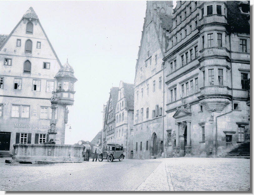 Kurz vor Rothenburg wurde die erste Übernachtung eingelegt. Pro Person kostet das Quartier 1,50 Reichsmark. Nach dem Kirchgang in dieser romantischen Stadt ging es am 26. Juni 1932 weiter nach Nürnberg. Hier wurde das Hans Sachs Denkmal besichtigt. Es fanden sich viele Zuschauer ein, die den kleinen BMW bewunderten.