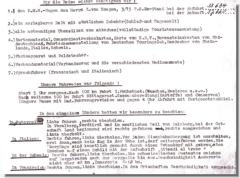 Das Fahrtenbuch, bzw. Album hatte dieses Titelblatt. Brand ist ein Ortsteil von Aachen. Die Unterlagen hat mir freundlicherweise Herr Karl von Hoegen, der Enkel des BMW Dixi Besitzers, zur Verfügung gestellt. Dafür bedanke ich mich an dieser Stelle noch einmal ganz besonders. Wer den ganzen Bericht in der Originalfassung lesen möchte, kann sich bei mir melden.