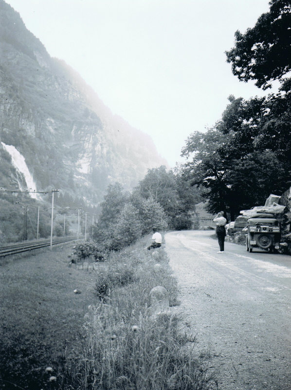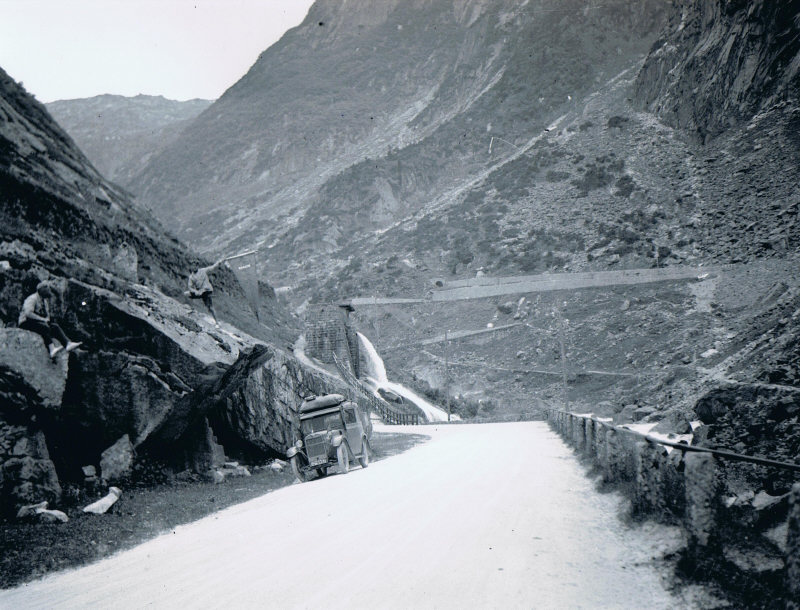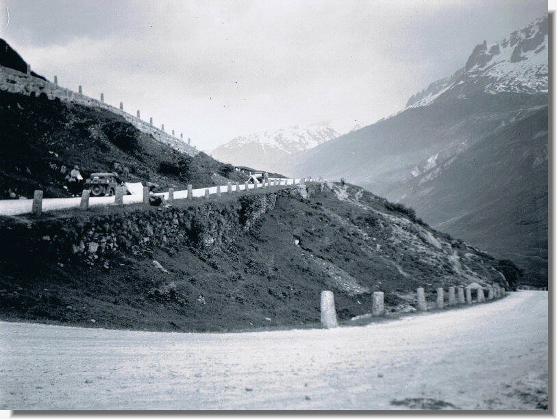 Der Wasserfall. Weiter geht es nach Arbedo und kurz vor Faio wird „abgekocht“. Dann geht es ständig aufwärts dem St. Gotthard entgegen. Dazio, Fiesco, Ambri und Piotta sind schon mit größter Vorsicht zu befahren. Bald ist die Schneehöhe erreicht und dort natürlich eine Schneeballschlacht veranstaltet. Tief unten im Tal sieht man den südlichen Ausgang des St. Gotthardtunnels bei Airolo. Es geht aber immer noch weiter nach oben und in fast schwindelnder Höhe winden sie sich durch meterhohe Schneewände. Der BMW arbeitet wie ein Uhrwerk (original aus dem Bericht entnommen!). Auf dem Plateau frieren die nur leicht bekleideten Männer und bringt sie zum zittern. In der Höhe von 2112 Metern treffen sie wieder auf Aachener, die dort Andenken kaufen. Nun beginnt die Talfahrt nach Hospental-Andermatt. Der Eindruck durch diese Riesenberge der Alpenwelt ist urgewaltig und überwältigend. Neben einer englischen Familie, die im Auto von Ägypten nach London unterwegs ist, wird das Nachtlager aufgeschlagen.