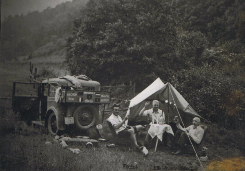 Ein Foto während der Italienfahrt. Der BMW DA 2 mit der markanten Gepäckkiste. Diese war beschriftet mit den Reisezielen. Links sitzt Willy Horbach, in der Mitte Gottlieb Goebels und rechts Ludwig von Hoegen. Das Zelt wurde auf einem Dachgepäckträger verstaut. Die Jungs ließen es sich gut gehen: Prosit! Es soll erwähnt werden, dass Gottlieb Goebels eine Beinprothese trug – im Bericht schlicht als „Holzbein“ bezeichnet.